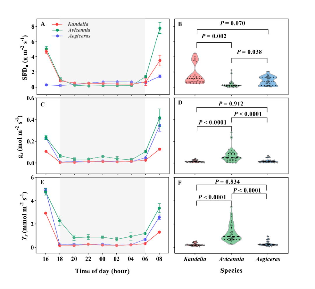 Nocturnal sap flow as compensation for water deficits: an implicit water-saving strategy used by mangroves in stressful environments