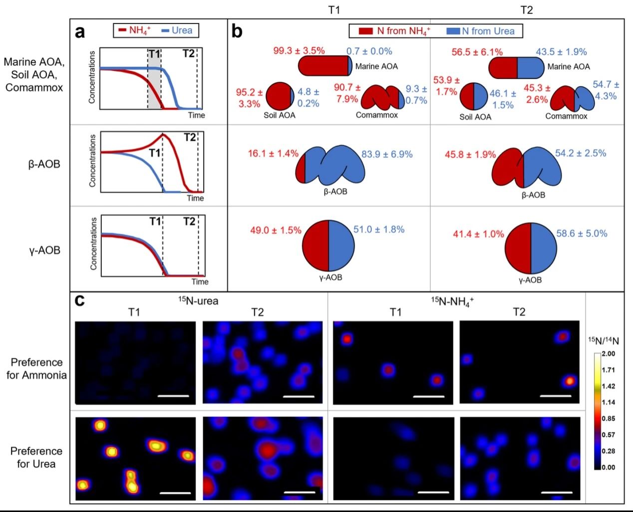 Ammonia-oxidizing microorganisms (AOM) contribute to one of the largest nitrogen fluxes in the global nitrogen budget. Four distinct lineages of AOM: ammonia-oxidizing archaea (AOA), beta- and gamma-proteobacterial ammonia-oxidizing bacteria (β-AOB and γ-AOB) and complete ammonia oxidizers (comammox), are thought to compete for ammonia as their primary nitrogen substrate. In addition, many AOM species can utilize urea as an alternative energy and nitrogen source through hydrolysis to ammonia. How the coordination of ammonia and urea metabolism in AOM influences their ecology remains poorly understood. Here we use stable isotope tracing, kinetics and transcriptomics experiments to show that representatives of the AOM lineages employ distinct regulatory strategies for ammonia or urea utilization, thereby minimizing direct substrate competition. The tested AOA and comammox species preferentially used ammonia over urea, while β-AOB favoured urea utilization, repressed ammonia transport in the presence of urea and showed higher affinity for urea than for ammonia. Characterized γ-AOB co-utilized both substrates. These results reveal contrasting niche adaptation and coexistence patterns among the major AOM lineages. algicidal technology and its application in controlling environmental harmful algae.