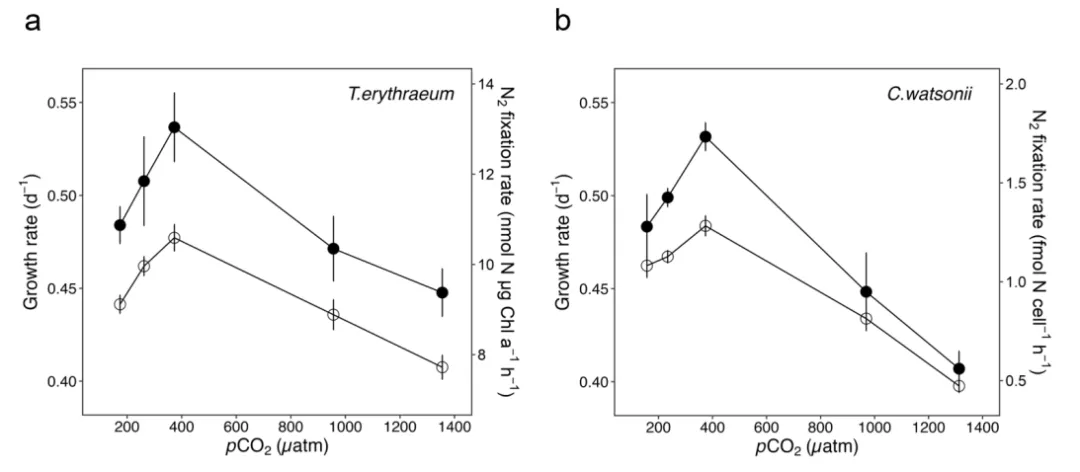 Biological N2 fixation has been crucial for sustaining early life on Earth. Very negative δ15N values detected in Archean sediments, which are not observed in present-day environments, have been attributed to the low efficiency of proto-nitrogenases. Alternatively, variations in early atmospheric CO2 may also play a role. Here we examine the effects of CO2 concentrations on the biomass δ15N signatures of the diazotrophs Trichodesmium erythraeum and Crocosphaera watsonii, which utilize Mo-Fe nitrogenase (the most common form of the enzyme). Our results show that these organisms produce biomass with δ15N values up to~3‰ lower under both decreased and elevated CO2 concentrations compared to modern levels (~380 μatm). These deviations from modern CO2 levels reduce nitrogenase enzyme efficiency, leading to increased organismal isotopic fractionation during N2 fixation. This study offers an alternative explanation for the observed fluctuations in geological δ15N records and provides new insights into the past nitrogen cycle on Earth.