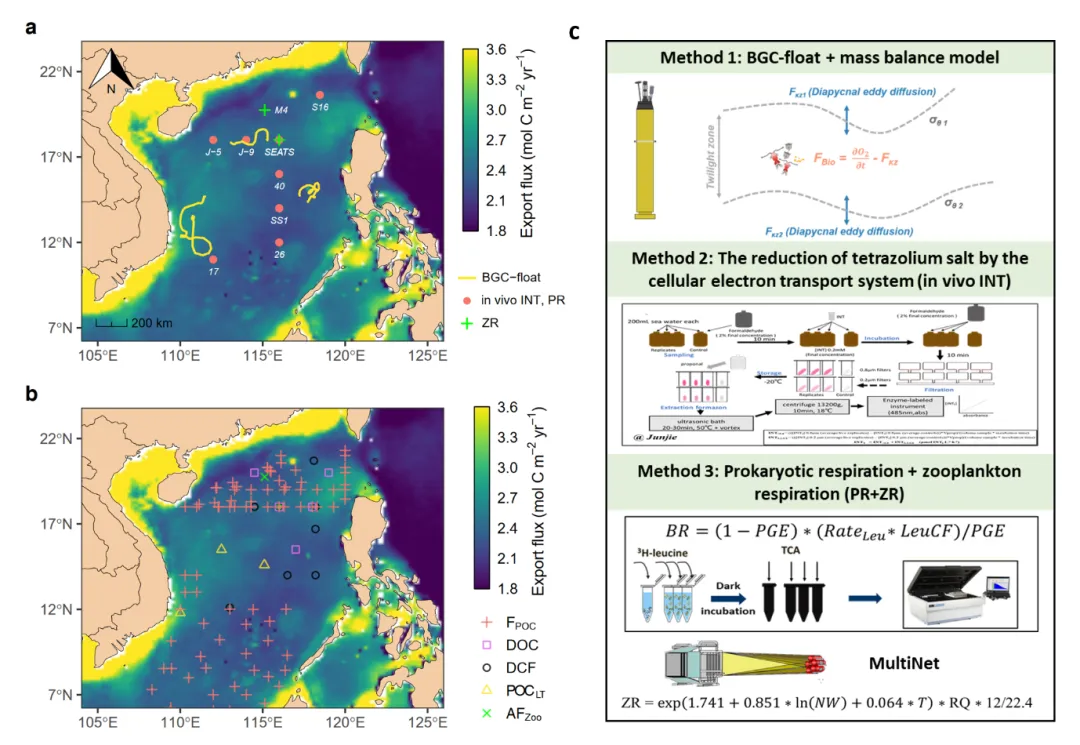 The twilight zone remineralization (TZR) consumes over 70% of organic carbon exported from the sunlit ocean, significantly affecting oceanic carbon sequestration and atmospheric CO2 concentration. Despite the wellestablished importance, the quantification of TZR remains challenging, as reflected by conspicuous methodological discrepancy and the unsolved imbalance between carbon supply from the upper layer and demand at depth. Here we combined three independent approaches, including biogeochemical profiling floats (BGC-float) observation, in vivo reduction of the tetrazolium salt by the cellular electron transport system (in vivo INT), and the synthesis of prokaryotic respiration (PR) determined by radiolabeled leucine incorporation and zooplankton respiration (ZR) empirically estimated from the biomass (PR + ZR), to investigate the TZR in the South China Sea basin. Our results show that the BGC-float and PR + ZR approaches gave more consistent results, with the respective values of 5.1 +/- 0.5 and 6.4 +/- 3.0 mol C m- 2 yr- 1. However, in vivo INT approach yielded a TZR nearly an order of magnitude higher at 30.0 +/- 6.1 mol C m- 2 yr- 1. To further reconcile methodological discrepancies, we estimated the possible range of carbon supply by integrating comprehensive carbon sources, including sinking particles, dissolved organic carbon input, lateral transport, dark carbon fixation, and active carbon transport by zooplankton migration. After considering multiple carbon sources, we successfully balanced the carbon demand as indicated by BGC-float and PR + ZR approaches. Our intercomparison exercise suggests a potential overestimation of TZR by the in vivo INT approach, and also highlights the importance of integrating multiple carbon sources in closing the twilight zone carbon budget.