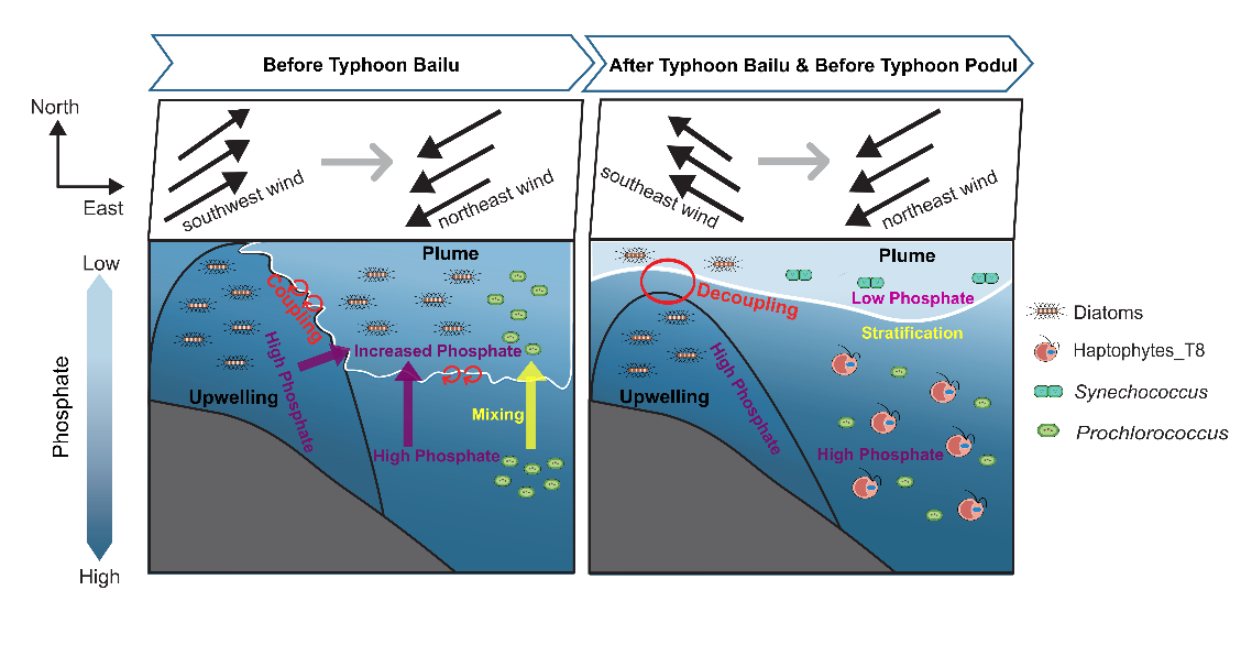 Phytoplankton responses to typhoons are pivotal for understanding the impact of climate change on marine biodiversity and productivity, yet current literature, focusing on typhoon-induced biomass increases from nutrient dynamics, might overlook the complexity of plume-upwelling interactions during such events. This study, therefore, examines the sequential impact of Typhoons Bailu and Podul on phytoplankton biomass and community structure in the northern South China Sea, a region where the interplay of riverine discharges and oceanic upwelling shapes the ecological landscape. Employing a combination of in-situ hydrographic measurements, pigment analysis, and satellite data, we tracked the pre- and post-typhoon phytoplankton dynamics, capturing a detailed picture of their response to the rapid hydrodynamic changes induced by these meteorological disturbances. Prior to Typhoon Bailu, a synergetic interaction between the Pearl River plume and coastal upwelling resulted in a diatom-rich phytoplankton assemblage. The passage of Typhoon Bailu followed by Typhoon Podul uncoupled this synergy, leading to phosphate scarcity and a notable decline in overall phytoplankton biomass. This decoupling favored the proliferation of smaller phytoplankton such as Synechococcus and haptophytes_T8, indicating a shift towards a community adapted to phosphate-poor environments. The distinct phytoplankton response patterns observed in this study not only challenge existing paradigms about typhoon impacts on marine productivity but also highlight the complex and potentially transformative effects of typhoon-induced hydrodynamic alterations, although whether the pattern of biomass reduction is generalizable to all similar typhoon events remains uncertain. These insights are essential for modeling the ecological ramifications of such disturbances, which is becoming increasingly important as the frequency and intensity of extreme weather events continue to rise.