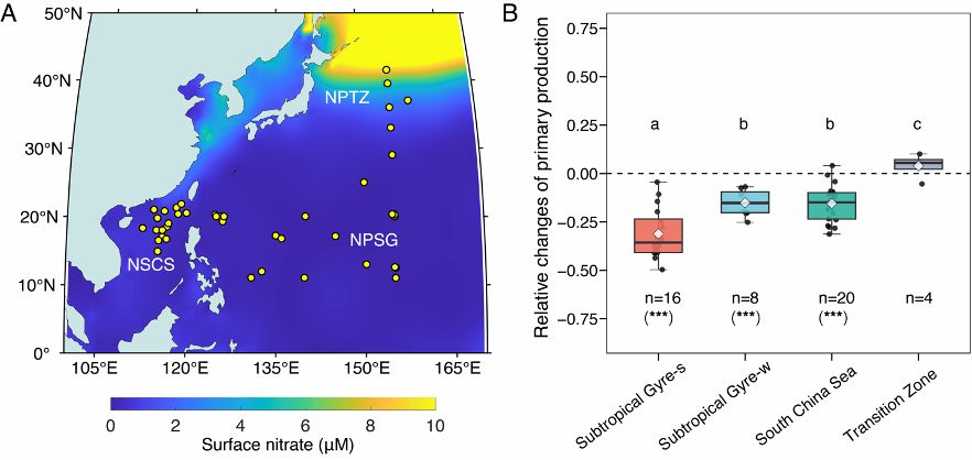 Ocean acidification caused by increasing anthropogenic CO2 is expected to impact marine phytoplankton productivity, yet the extent and even direction of these changes are not well constrained. Here, we investigate the responses of phytoplankton community composition and productivity to acidification across the western North Pacific. Consistent reductions in primary production were observed under acidified conditions in the North Pacific Subtropical Gyre and the northern South China Sea, whereas no significant changes were found at the northern boundary of the subtropical gyre. While prokaryotic phytoplankton showed little or positive responses to high CO2, small (<20 µm) eukaryotic phytoplankton which are primarily limited by low ambient nitrogen drove the observed decrease in community primary production. Extrapolating these results to global tropical and subtropical oceans predicts a potential decrease of about 5 Pg C y−1 in primary production in low Chl-a oligotrophic regions, which are anticipated to experience both acidification and stratification in the future.