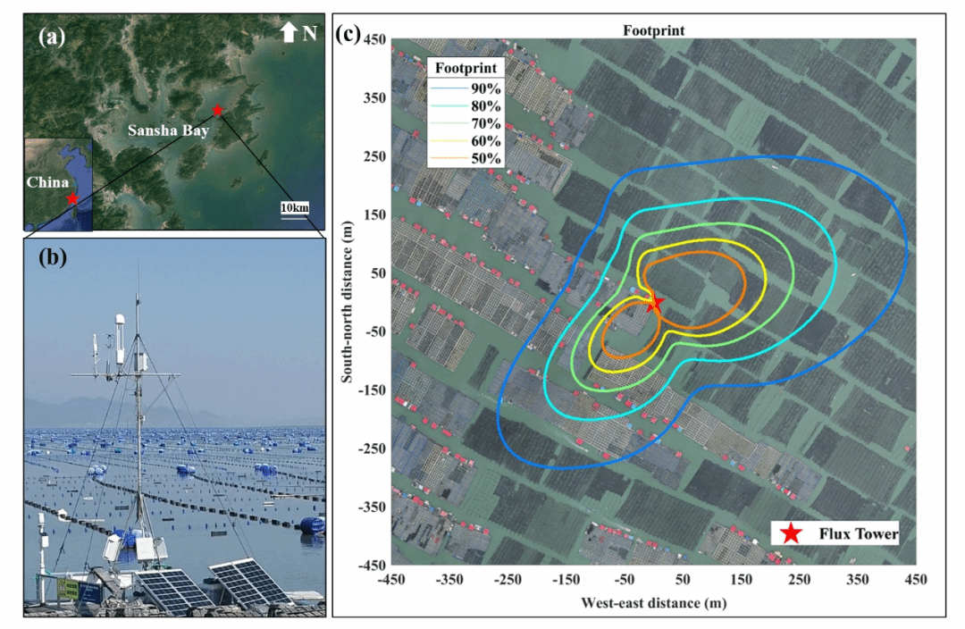 Macroalgae aquaculture has been increasingly recognized as a promising nature-based solution to enhance carbon sinks towards climate change mitigation. However, a limited understanding of the temporal patterns of air-sea carbon dioxide (CO2) fluxes and their environmental controls across time scales poses an enormous obstacle to the carbon sink potential assessment of macroalgae aquaculture. Here, we utilized the eddy covariance (EC) approach to acquire continuous and high-frequency measurements of net ecosystem exchange (NEE) of CO2 over the macroalgae aquaculture in a subtropical enclosed bay in southeast China, throughout one full year from April 2023 to March 2024. The results showed (a) this ecosystem acted as a CO2 source in most months with the strongest source and sink occurring at the beginning of autumn and winter, respectively; (b) annually this ecosystem emitted 58.9 g C m−2 of CO2 into the atmosphere with nighttime source contributing 84.7 %; (c) macroalgae aquaculture of Saccharina japonica and Gracilariopsis Lemaneiformis tended to reduce CO2 emission from this ecosystem, while the extent of the reduction varied with aquaculture types and growth stages; (d) temporal variability of NEE was most correlated with air temperature, while faster tidal currents tended to stimulate CO2 emission during both flood and ebb tides. The strong temporal variability of NEE highlights the importance of high-frequency EC measurements in improving the understanding of temporal patterns of air-sea CO2 fluxes over the macroalgae aquaculture ecosystems. This study suggests that macroalgae aquaculture has the potential to mitigate CO2 emission, although the ecosystem itself overall functions as a net CO2 source on an annual time scale.