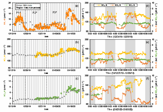 The dynamics of nutrient cycling in inland waters, particularly during algal blooms, play a critical role in shaping aquatic ecosystems. However, the interaction between phytoplankton and inorganic nitrogen during low-flow periods remains poorly understood. This study presents high-frequency monitoring of ammonium (NH4-N), nitrate (NO3-N), nitrite (NO2-N) and phytoplankton communities in a subtropical river-type reservoir during the low-flow winter period, characterized by blooms dominated by cryptophytes and green algae. Our results revealed that NH4-N concentrations exhibited a diurnal pattern of decreasing during the day and increasing during the night, which was negatively correlated with total algal biomass at the intraday fluctuation scale (coefficient = −0.378, p = 0.028), indicating strong algal uptake of ammonium during daytime. NO3-N and NO2-N concentrations, however, did not show clear diurnal co-varied patterns with algae. On the day-to-day scale, the external nitrogen inputs resulting from rainfall contributed to the changes, particularly after extended dry periods. We observed low NH4-N concentrations and total algal biomass during the end of algal bloom. However, 3–4 days later ammonium thrived, followed by another algal bloom. Algal bloom occurrences caused large diurnal fluctuations in reservoir NH4-N concentrations (daily differences >5 μmol L−1), resulting the maximum nighttime NH4-N flux reaching up to five times the minimum daytime flux. Our study highlights the advantages of high-frequency synchronous monitoring of nutrient-algae dynamics to understand their interactions, and the importance of ammonium control on preventing algal blooms during low-flow winter periods.