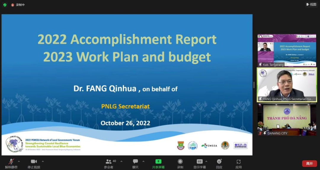10月26日上午,2022东亚海岸带可持续发展地方政府网络(PNLG)年会召开,厦门大学海洋与海岸带发展研究院(以下简称海发院)参加了会议。PNLG秘书处副秘书长、PNLC副主席、海发院副院长方秦华教授代表秘书处向成员大会做2022年工作进展和2023年工作计划及预算报告。